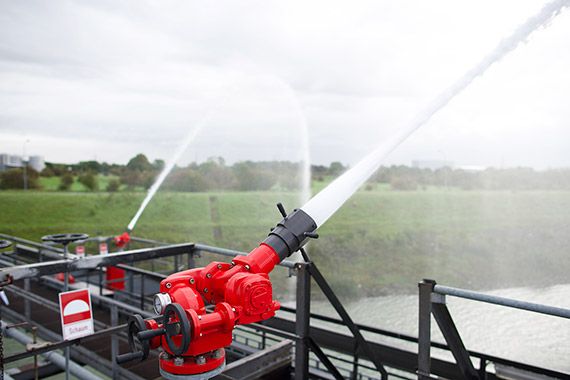 消防炮通常安装在塔架上,即使在逆风条件下也能实现高效消防,并保护塔架不受水位上升的影响。FireDos 消防炮的设计适用于从 500 升/分钟到 60 000 升/分钟的灭火剂流量。由于采用了流量优化的椭圆形扁平设计,压力损失非常小,从而使消防炮能够达到最大的覆盖范围。与自动灭火系统集成后,遥控 FireDos 消防炮可在安全距离内进行精确灭火。